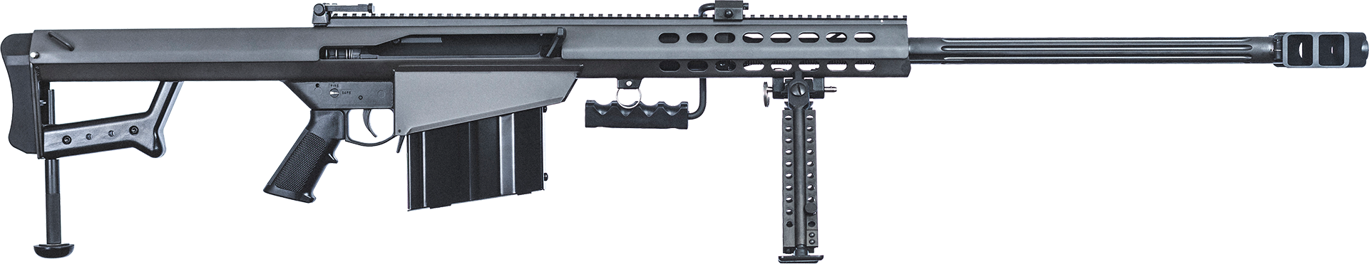 As the first shoulder-fired semi-automatic .50 caliber rifle available, the Model 82A1 continues to blaze new territory. Its chamber is chrome plated and dimensioned for both civilian and military ammunition. The extractor and ejector are proven to work under any condition, and close tolerances on every part allow it to function in all environments. The muzzle brake, dual barrel springs and long mainspring design make this iconic rifle comfortable and exciting to shoot. It features a muzzle brake,fluted barrel, dual barrel springs, and a M1913 optics rail. Included is a 10 round magazine, carry handle, bipod, monopod, and a hard carrying case.