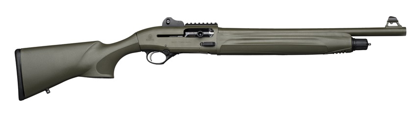 Beretta’s 1301 Tactical gas operated semi-automatic shotgun is designed for law-enforcement and home-defense. It is engineered to be ultra-reliable, easy to use, has all the features that a modern tactical shotgun should offer, and a compact size, making it ideal for negotiating tight spaces. The integrated Blink gas operating system, featuring a cross tube gas piston, allows the 1301 Tactical to cycle 36 percent faster than any other shotgun on the market. The 1301 Tactical features an oversized charging handle, large textured bolt release and an oversized reversible safety button. Its aggressive checkering on the fore-end and stock makes it easy to gain a secure grip even while wearing gloves. The stock is also adjustable for length of pull with provided spacers, and the drop and cast are adjustable as well. Its barrel features a ghost-ring rear with an interchangeable front sight, and interchangeable choke system. Included is an OptimaBore, HP Improved Cylinder (flush configuration). The receiver is constructed of an aircraft-grade aluminum with a MIL-STD 1913 Picatinny rail, making it a snap to add optics without modification to the shotgun. This 12 gauge model has an OD green finish, 18.5″ barrel, and a 3″ chamber.