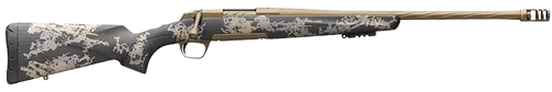 Big game bolt-action hunting rifle with carbon fiber stock with accent graphics, Cerakote Burnt Bronze finish on a stainless steel barrel and action, spiral fluted bolt, spiral fluted and lapped sporter barrel, threaded muzzle, Recoil Hawg muzzle brake and thread protector included.