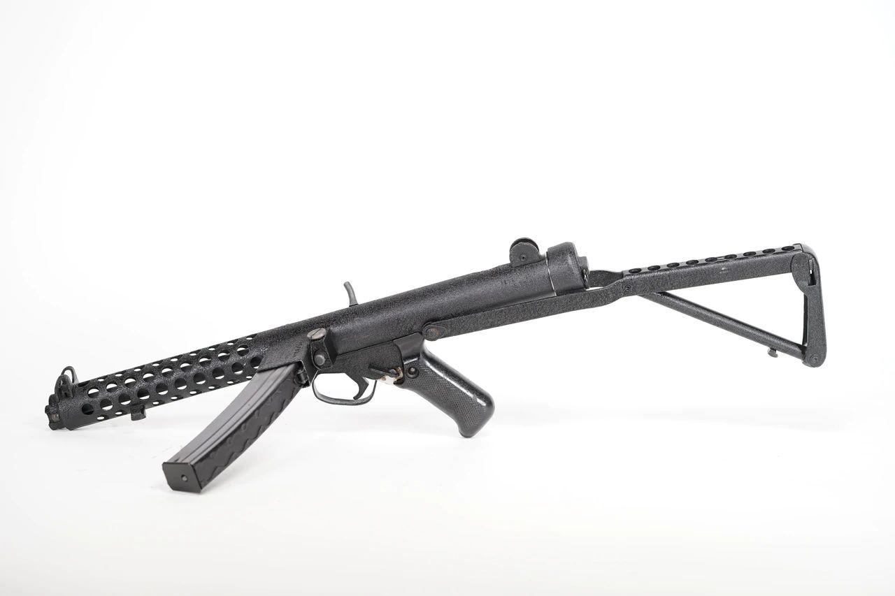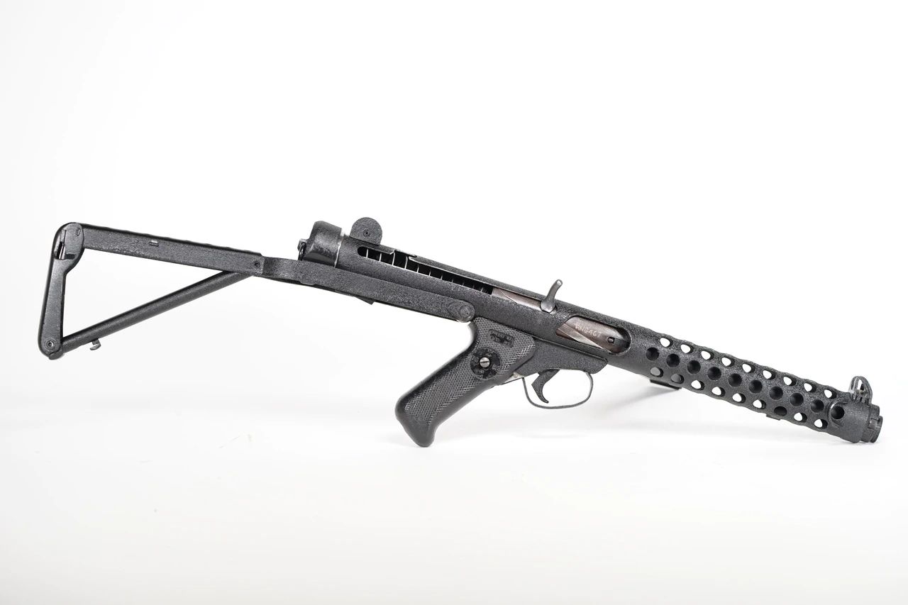 The Catco (California Arms Tech Co) Sterling 9mm SMG submachine gun is constructed entirely of steel and plastic and has a shoulder stock, which folds underneath the weapon. There is an adjustable rear-sight, which can be flipped between 100 and 200 yard settings. Although of conventional blowback design firing from an open bolt, there are some unusual features: for example, the bolt has helical grooves cut into the surface to remove dirt and fouling from the inside of the receiver to increase reliability. There are two concentric recoil springs which cycle the bolt, as opposed to the single spring arrangement used by many other SMG designs. This double-spring arrangement significantly reduces “bolt-bounce” when cartridges are chambered, resulting in better obturation, smoother recoil and increased accuracy. Additionally, the Sterling uses a much-improved (over the Sten) 34-round curved double-column feed box magazine, which is inserted into the left side of the receiver. The magazine follower, which pushes the cartridges into the feed port, is equipped with rollers to reduce friction. The bolt feeds ammunition alternately from the top and bottom of the magazine lips, and its fixed firing pin is designed so that it does not line up with the primer in the cartridge until the cartridge has entered the chamber.