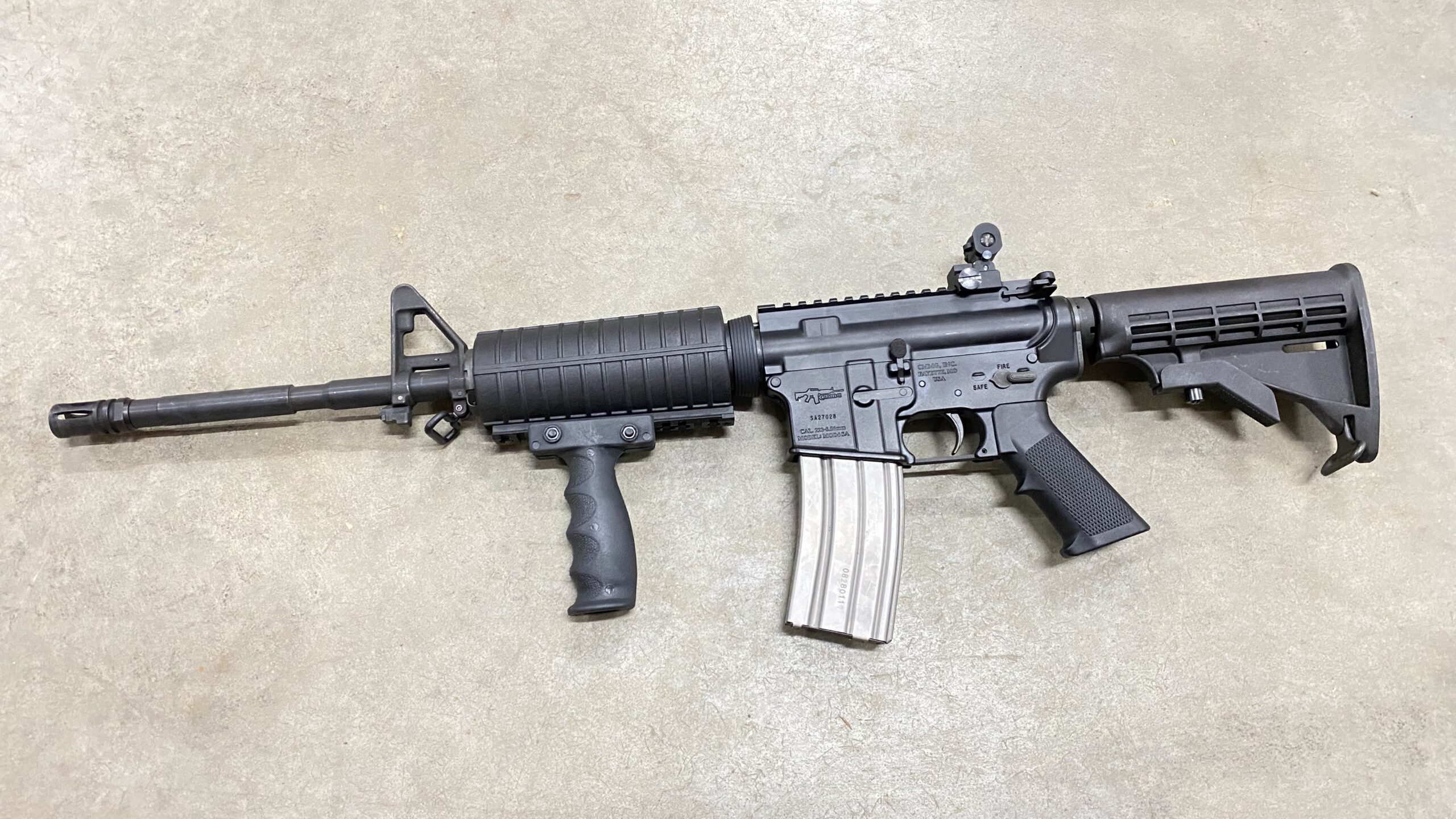 Used in great condition. Ships with one 30 round magazine. Rear flip up iron sight with dual aperture. Foregrip – unknown brand. Barrel is CMMG WASP 5.56 NATO with 1/9 twist. CMMG stock.