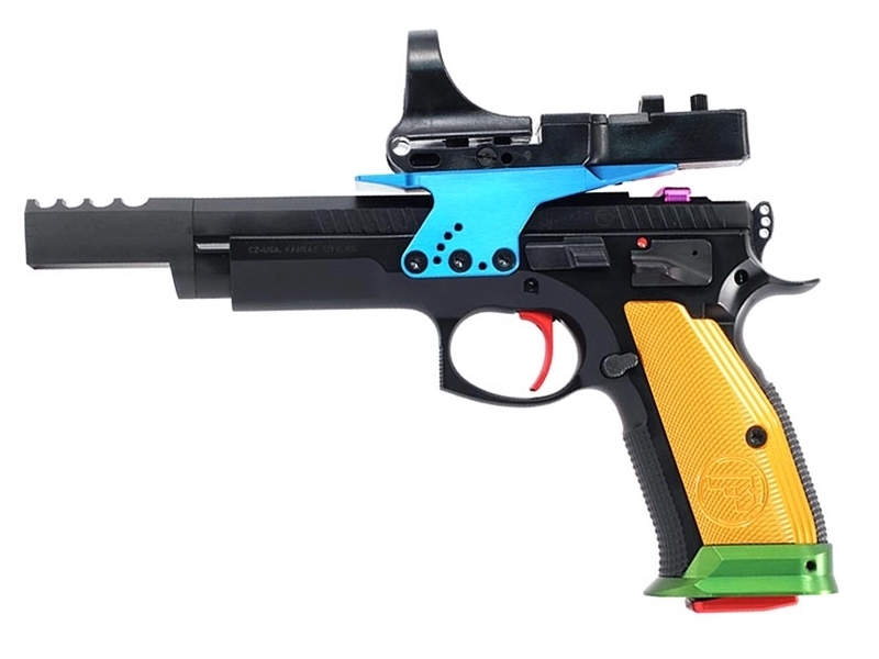 75 TS CZECHMATE PARROT 9MM CZ’s Parrot is the competitor’s best friend as well as the collector’s holy grail. With Czechmate producing less than 10 per year with less than five imported to the United States the Parrot is one of the most exclusive CZs on the market. – Not only are they incredibly rare but they also feature a unique color design mimicking a parrot along with all the features you have come to expect with a Czechmate pistol. A newly redesigned single action hammer new trigger beautify anodized in red thin yellow aluminum grips a purple cocking lever an exclusive green magazine funnel three 20 round magazines with red bottoms and a blue anodized C-More mount with included C-More sight. – Stand out at your next match or revel in the knowledge that you own one of the finest CZ 75 variants ever produced. Not only will other CZ collectors envy you but you will also shoot faster and flatter ensuring you place better than you did before. – Features – C-more sight with frame mount – Ambidextrous slide racker – 4 port compensator & optional front sight adapter – Aluminum grips – Aluminum magwell – Newly designed SA competition hammer – New trigger design – Exclusive color configuration – Caliber: 9mm Luger – Capacity: 20 Rounds – Magazine Type: Double Stack – Grips: Thin Aluminum – Trigger Mech: SA Only – Sights: Fixed/C-more – Barrel: Cold Hammer Forged Threaded – Barrel Length: 5.4 in – Weight: 3 lbs – Overall Length: 10.47 in – Height: 5.51 in – Width: 2.44 in