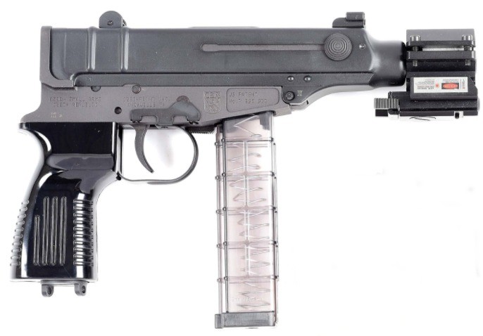 Czech Small Arms VZ-61 Scorpion semi automatic pistol chambered in 9x18mm Makarov. 4-1/2″ round barrel, protected front post sight, 75 and 150 meter graduated flip rear sight, stamped matte upper, milled lower and plastic thumb rest pistol grip. Barrel mounted with a laser sight. CONDITION: Excellent. Very light signs of use. Fine mirror bore. Functions appropriately when cycled by hand.