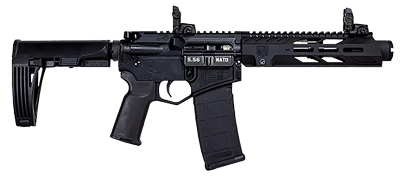 This DB15 Pistol features a pistol-length, heavy, 4150 ChromeMoly barrel with KAK flash can, pistol-length gas system, shot-peened Mil-Spec 8620 bolt carrier. It utilizes 7075-T6 receivers, 9″ M-Lok handguard, Magpul MOE-K2+ grip, MBUS sights, and a Tailhook MOD 2 brace.