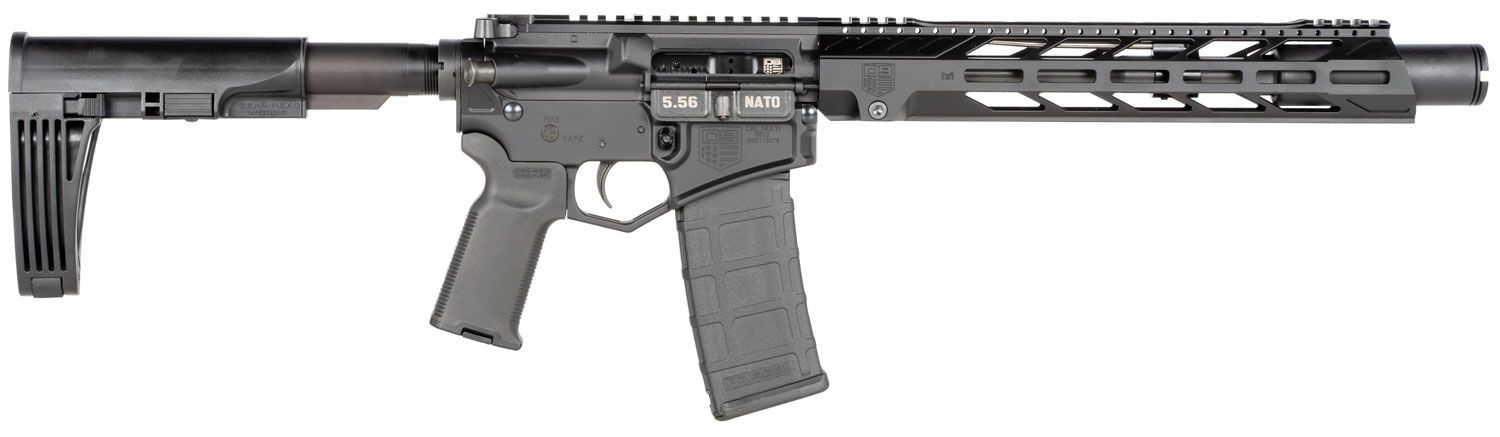 The Diamondback DB15 is a accurate, reliable, and lightweight AR-style pistol that is excellent for personal protection or for taking to the range. It sports a Gearhead Works tailhook Mod2 brace, a KAK flash can, a 13 inch M-LOK handguard, MBUS sights, and a 30 round magazine.