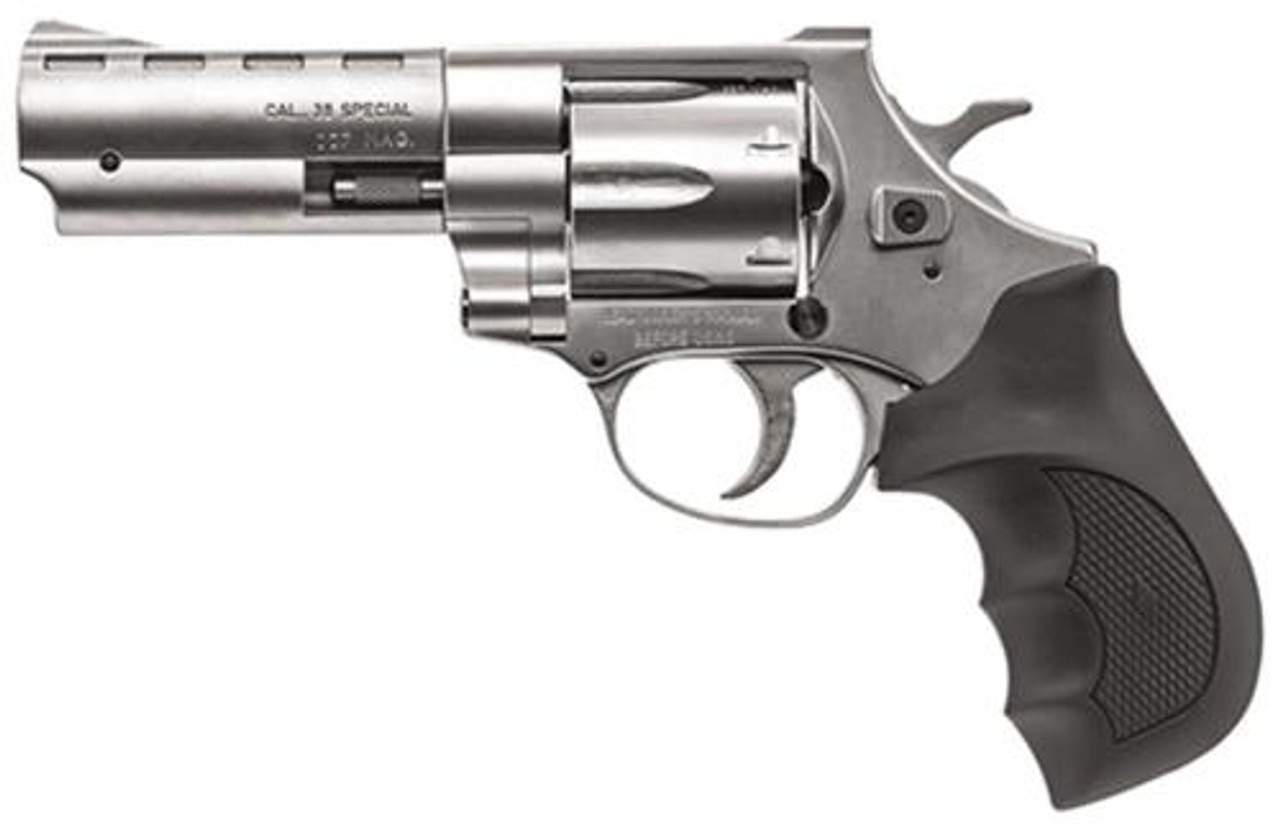 his 357 Magnum has a steel frame with a 4″ barrel and a nickel metal finish.
