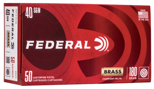 Federal Cartridge Company Champion 40 Smith & Wesson ammunition features a 180 grain full copper jacketed lead core flat point bullet, brass case, and non-corrosive boxer primer. Packaged 50 rounds to a box, 1,000 rounds (20 boxes) to the case.