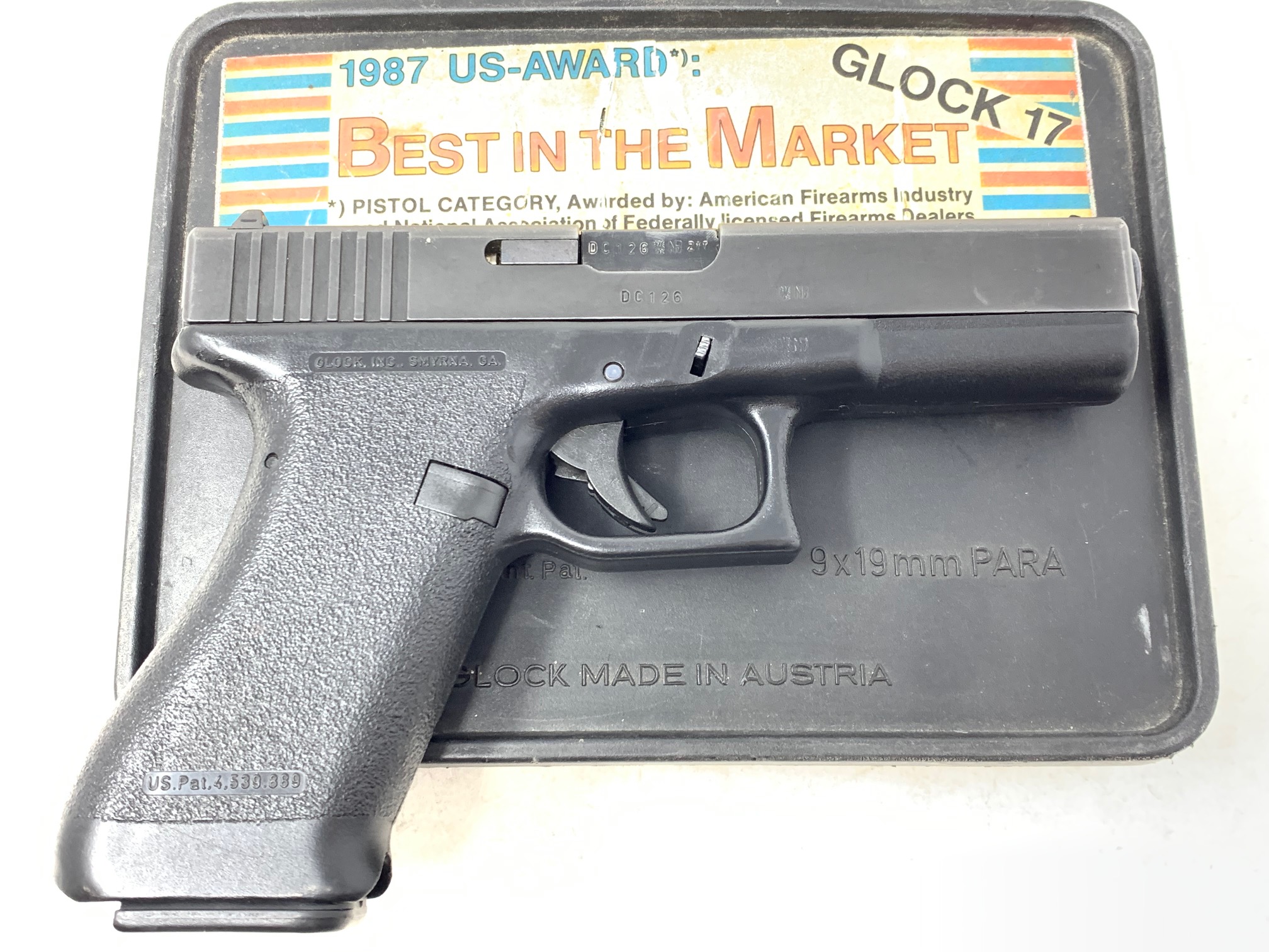 This listing is for a Glock Gen1 17 with 1 U notch magazine well. You can tell it is a gen 1 by the smooth front and back grip. It has the orignal guide rod and spring. Serial number dates it to 1988 DC126. Serials match on barrel, slide and frame. Box is and original tupperware style container. It is not serialized for the gun. Item is in overall good working condition.