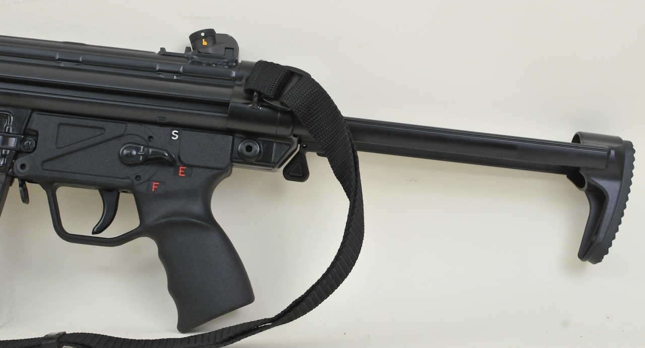Many parts of the HK53 are interchangeable with the MP5, they are so similar in size. The example above shows us the newer style concave buttplate that until recently was only reserved for the MP5 series. It is now available for the 33 and 53 series. The forks are slightly longer on this model than for the MP5 series. The four prong flash hider seen here is now standard. It does much more to suppress the flash from this short barreled weapon than did the more standard flash hider seen on the 33 and G3.