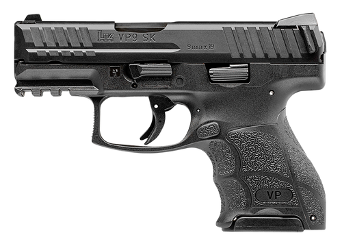 The eagerly anticipated subcompact model of the acclaimed Heckler & Koch VP Series handgun, VP9SK has all of the sought-after characteristics of larger frame VP pistols but in a more concealable design. The highly-rated HK VP precision strike trigger is also found on the VPSK. It has a short, light take-up with a solid, single action type break followed by a short positive reset. The net result is trigger quality unmatched in production striker fired pistols. A small-scale interpretation of the completely adjustable VP grip feature consisting of interchangeable backstraps and lateral grip panels is replicated in the compact grip frame of the VP9SK. Molded finger grooves in the front of the pistol’s grip also instinctively position an operators hand for optimal shooting. All controls are completely ambidextrous. Slide releases are present on both sides of the frame and the paddle style magazine release can be easily activated by left- or right-handed shooters. The charging supports are simple components that are mounted on each side of the rear of the slide and provide better gripping leverage for racking the slide rearward. The charging supports speed reloading and make operating the VP easier for shooters with reduced hand strength. VPSK pistols have an abbreviated Picatinny MIL-STD-1913 rail molded into their polymer frame for mounting lights and accessories. HK’s famous cold hammer forged barrel made from cannon grade steel ensures a long service life. The VPSK’s machined steel slide is protected from corrosion and wear by HKs hostile environment finish and all metal components, including springs and pins have superior metallurgy. Despite their small size, VPSK subcompacts have excellent weight and balance making them naturally pointable, easy to control, and accurate to shoot.