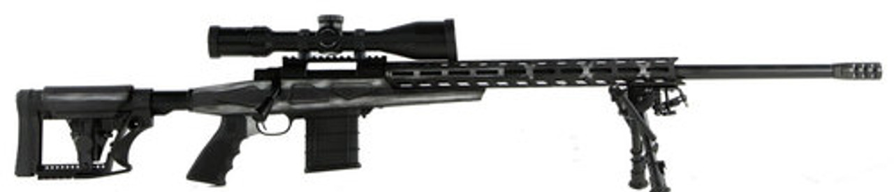 This 308 Winchester model has a 24″ heavy barrel with a three chamber muzzle brake, and features a grayscale American flag Cerakote finish on the chassis.