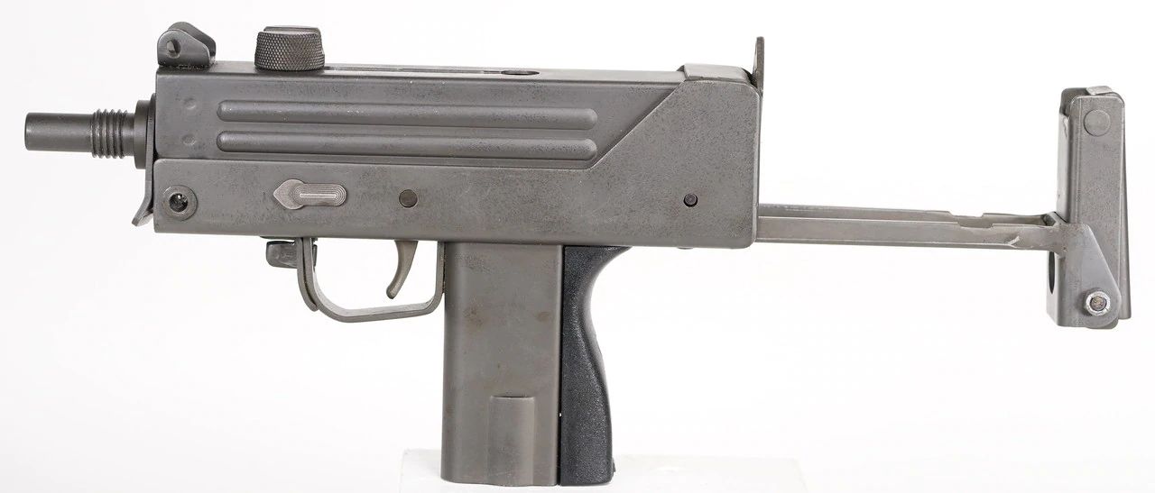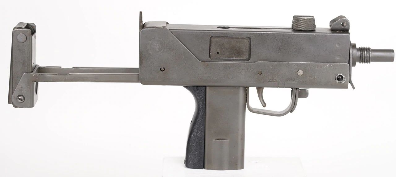 SN A604408. Cal. 9mm. 6″ bbl. Extremely fine condition MAC INGRAM M10A1 registered in both 9mm and 45 ACP with Stephenville, Texas address on right side of frame. Safety is a “Push through the trigger guard” type reminiscent of the M1 Garand rifle. Heavy duty knurled cocking knob at top of receiver with recess to be able to view front sight. Telescoping buttstock at rear of receiver. Selector on left side indicates “1” and “32”. Included is one high capacity magazine and cardboard shipping box. This is a very well made and hefty specimen, well suited for either 45 ACP or 9mm but currently in 9mm. Recessed circular cut-out on right side of frame as factory finished. This is a National Firearms Act item and requires BATF approval prior to transfer. This weapon is fully transferable on an ATF form 3 or form 4. CONDITION: Overall appearance and finish extremely fine, smooth gray orig finish on all metal parts to include magazine. Mechanics are crisp, bore is very fine and brilliant with some firing residue. A very nice specimen from a rare manufacturer. This should be of interest to forward thinking collectors as these popular machine gun models are enjoying a rise in popularity. 53237-2 JWK (5,500-7,500) –