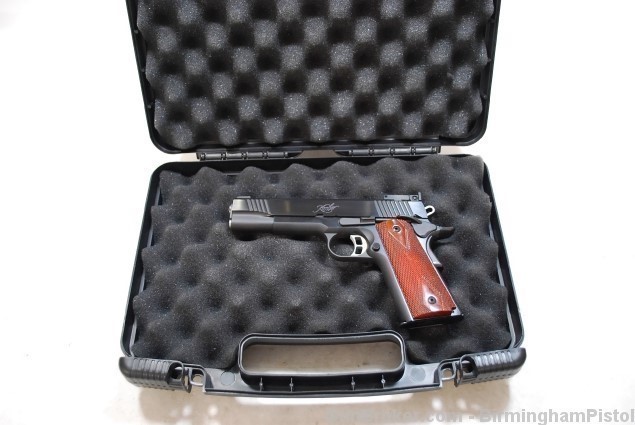Caliber: .45 ACP Height (inches) 90° to barrel: 5.25 Weight (ounces) with empty magazine: 38 Length (inches): 8.7 Magazine capacity: 8 Ambidextrous thumb safety Recoil spring (pounds): 16.0 Full-length guide rod Frame Material: Steel Finish: Matte Black, KimPro II Width (inches): 1.28 Slide Material: Steel Finish: Matte Black, KimPro II Barrel Length (inches): 5 Material: Stainless steel, match grade Stainless steel match grade bushing Twist rate (left hand): 16 Sights Kimber adjustable Radius (inches): 6.8 Grips Rosewood Double diamond Trigger Premium aluminum, match grade Factory setting (approximate pounds): 4.0 – 5.0