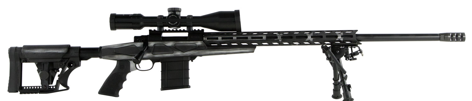 Howa’s HCR rifle features a fully adjustable Luth-AR MBA-4 buttstock with an aluminum chassis Hogue finger groove pistol grip and a 10-round magazine. It includes a 6-9 adjustable bipod Nikon Stirling Diamond 30mm 4-16×50 long range scope and a hard case. This 6.5 Creedmoor model has a 26 heavy barrel with a three chamber muzzle brake and features a grayscale American flag Cerakote finish on the chassis.