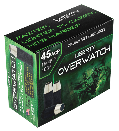 Liberty Ammunition OverWatch is faster, lighter to carry, and hits harder. Its custom hollow-point cavity hydrostatic event as it ruptures in soft tissue. Comes with 20 lead free cartridges per box.