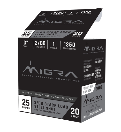 Manufactured in small batches, Migra steel shotshell loads are the answer to multiple hunting situations. The meticulously engineered formula delivers uniform patterns and consistent bulk densities that deliver increased kill-ratios with absolutely no fillers. Combined with patent-pending technology and carefully selected shot combinations, Migra shells are deadly and reliable.