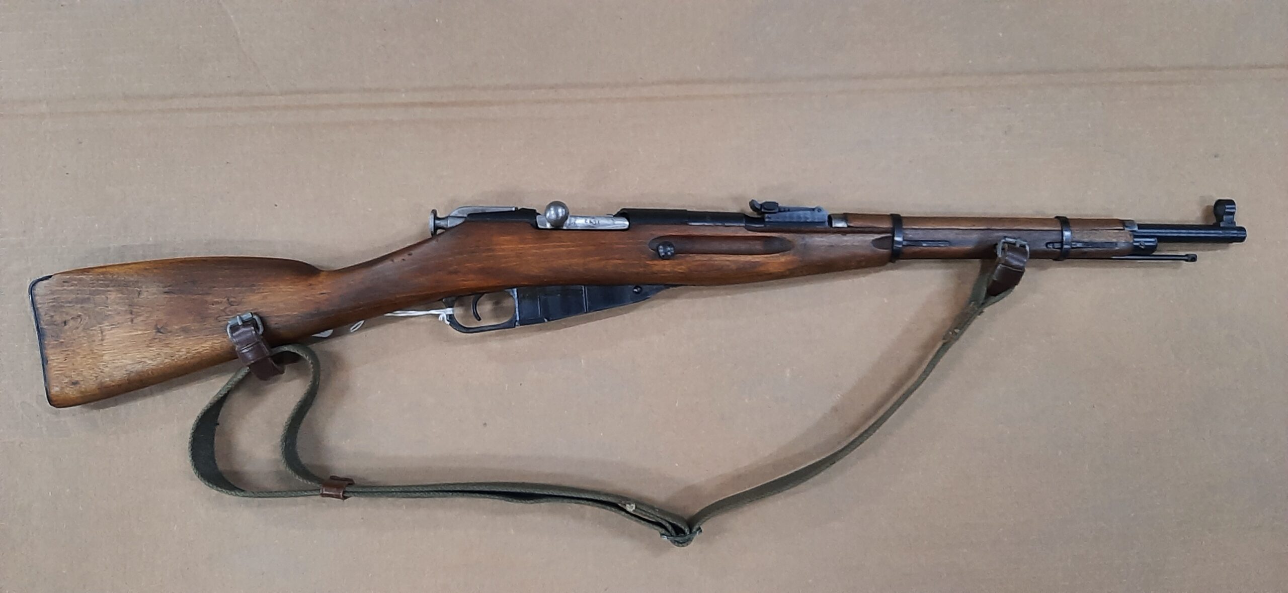 Mosin M38 carbine. 1943 production. Very good condition. Receiver has strong dark finish. Bolt has slight discoloration. Wood is free of major dings, but has discoloration at the wrist. Included canvas sling is in very good condition. TG Knox import marks.