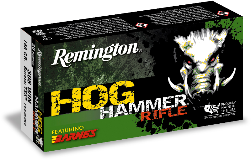 Hog Hammer penetrates even the thickest-skinned wild hogs with a Barnes TSX Bullet at its heart. With all-copper construction for deeper penetration than standard lead-core bullets, it’s the toughest expanding bullet on the market, offering near 100% weight-retention on-hog, while expanding rapidly to deliver devastating wound channels. Hog Hammer utilizes a flash-suppressed propellant for nighttime or low light hunts. Available in six calibers. Hog Hammer. Full-boar annihilation only Remington can provide.