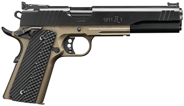 Remington R1 10MM Long Slide Hunter, Semi-automatic, 1911, 10MM, 6″ Stainless Match Grade Barrel, Stainless Steel Frame, FDE Cerakote Finish, Operator II VZ G10 Grips, 8Rd, 2 Mags, Ambidextrous Thumb Safety, Weighs 41oz Empty, Fiber Optic Front Sight, Adjustable Rear Sight 96305