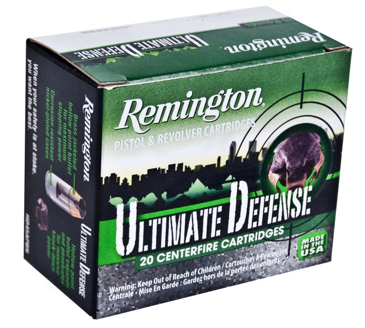 Remington’s line of Personal Defense ammunition is engineered to help you stop threats when everything depends on it. Ultimate Defense Full-Sized Handgun ammo uses a Golden Saber BJHP bullet which expands and penetrates for massive knockdown power. From bullets specially designed for controlled expansion and optimal energy transfer, to waterproofing and powders treated to reduce muzzle flash, its reliable stopping power stands ready for when you need it most.