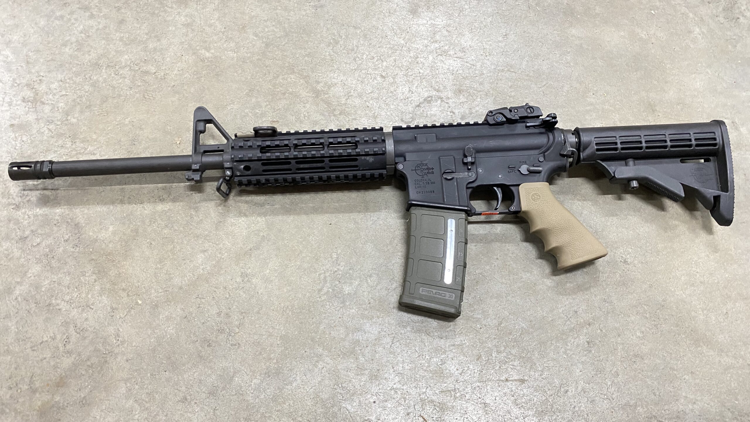 Used in good condition. Ships with one 30 round magazine. Flip up Magpul rear sight. FDE Hogue grip. Barrel has a 1/9 twist.