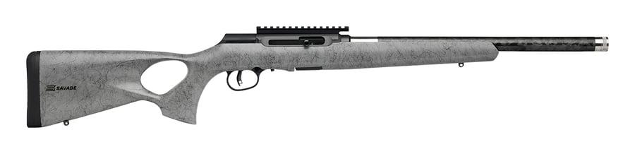 The A22 is a straight-blowback rimfire rifle chambered in .22 LR. The rifle features a 10-round rotary magazine and a Savage’s signature AccuTrigger that allows for an easily adjustable trigger pull. The Timber Thumbhole series features an ambidextrous thumbhole stock that is paired with a threaded barrel. The rifle also features sling studs and a weaver base for easy scope mounting. This model features a Grey Spiderweb finish stock and a carbon fiber barrel. One 10-round rotary magazine is included.
