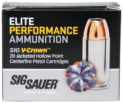 The Sig V-Crown stacked hollow point design provides a smaller, additional hollow point cavity behind the main cavity. This design, along with V-shaped jacket skives and scores, provides controlled, uniform expansion at all effective distances and velocities. The bullet has a unique toothed cannelure halfway up the shank to more effectively lock the jacket and core which provides exceptional structural integrity in a jacketed design, ensuring maximum weight retention and outstanding terminal performance. Brass cases are Techni-Crom coated for enhanced lubricity, superior corrosion resistance, and reliable feeding and extraction. Each caliber loading of Sig Sauer Elite Performance Ammunition is precisely matched to the core temper of its Sig V-Crown bullet to ensure maximum terminal performance.
