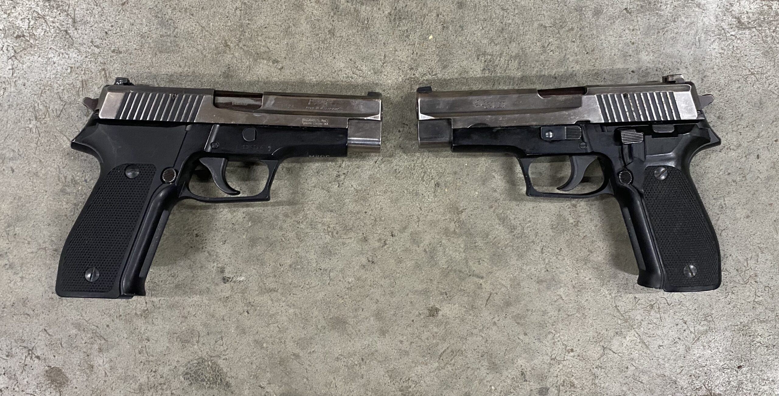 Take the bull by the horns and double down! We have an awesome pair of West German P226’s set up to be used in tandam. You will notice that the magazine releases are oriented for a left and right hand. Duel wield these at your next range day, or work on an improvised take on the Boondock Saints. This pair of 9mm’s will not let you down, they have seen some wear and tear but I promise they are ready for whatever you throw at them. The slides on the pair have been polished to make them appear stainless or nickel.