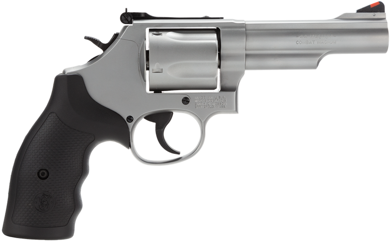 Smith & Wesson L-Frame revolver is built to suit the demands of the most serious firearms enthusiast and has a strong, durable frame and barrel built for continuous Magnum usage. The 69 model features a full top strap and barrel serration, ball-detent Lock-Up and 2-piece barrel. This model has a stainless steel barrel, frame, and cylinder. It also has a red ramp front and white outline adjustable rear sights, and black synthetic grip.