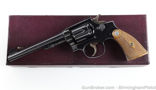 Built in the mid 1930’s this Model of 1905, 4th Change M&P Target is a wonderfully well preserved original example. The gun comes in the numbers-matching maroon display box that is positively MINT with the ’T’ marked on the bottom for the target configuration. The original bright blue finish is superb overall rating at 98% with only the faintest of wear at the muzzle ends and minor collector-type handling evidence. A K-frame that will be most difficult to ever upgrade!!