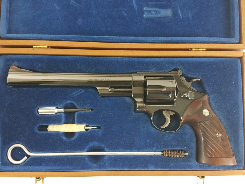 Excellent condition.S serial number 4 screw, pinned, recessed, diamond grips, target hammer, target trigger, fixed front w/adjustable white outline rear sights, retains +98% original blue and light drag line. Ships with wooden box with cleaning tools.