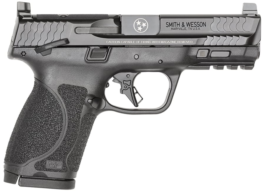 The M&P series is Smith & Wesson’s flagship duty pistol and has seen extensive use with many law enforcement agencies across America. The polymer frame allows the pistol to be lightweight and highly corrosion-resistant while the more flexible material helps to absorb recoil during firing. The pistol also features a striker action that allows for a consistent trigger pull on each shot along with an accessory rail for installing lights and laser aim devices. The Compact model features a shorter grip and barrel length for easier concealment. New for 2024, this special edition model features Tennessee’s Tri-Star emblem laser engraved on the barrel. The pistol also comes optics ready with suppressor height-sights and an optic cut designed to interface with Smith & Wesson’s C.O.R.E. adapter plates. Two 15-round magazines are included.