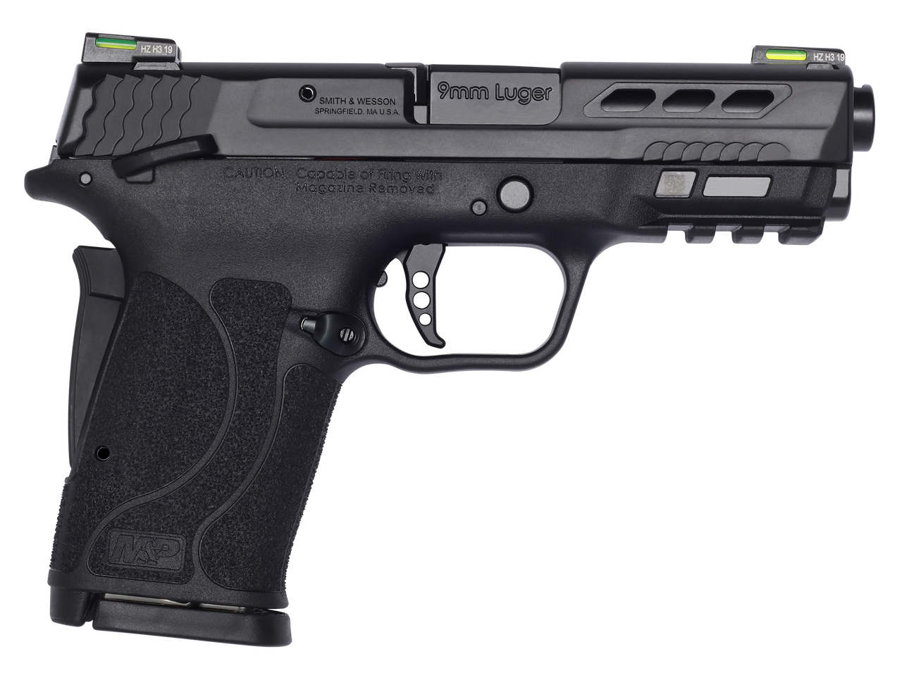 The Performance Center M&P 9 Sheild EZ pistol features a ported, high-bright finished barrel to reduce muzzle flip. Its easy to rack slide utilizes lightening cuts in the slide for reduced weight, while the Tactile loaded chamber indicator (TLCI) lets you see and feel if there is a round in the chamber. The PC flat face, black anodized aluminum trigger is crisp, lightweight and comes with tactile and audible trigger reset. The Performance Center M&P 9 Shield EZ pistol also features a PC enhanced black anodized aluminum grip safety, HI-VIZ Litewave H3 Tritium/Litepipe sights, and picatinny-style rail. It comes with two easy-to-load, 8-round magazines. Included is a Performance Center cleaning kit which features a collapsible cleaning rod with rotating t-handle; 10 cotton cleaning patches; nylon cleaning brush; bronze bore brushes and nylon jags (22 cal,9mm/357/38 cal,40/10mm cal,45 cal); nylon slotted tips.