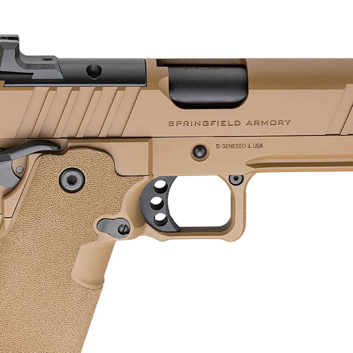 Springfield Armory 1911 DS Prodigy 9mm Luger 4.25in Coyote Brown Cerakote Pistol – 20+1 Rounds – The Prodigy from Springfield Armory takes the proven 1911 platform and enhances it with double-stack capacity and a performance-driven feature set. Finished in durable Coyote Brown Cerakote, the Prodigy features a polymer grip mounted to a forged steel frame, offering capacities of 17+1 and 20+1. The double-stack magazine feeds a 4.25-inch bull barrel with an 11-degree crown for match-grade accuracy. Optics-ready, the Prodigy utilizes AOS (Agency Optic System) plates with an integrated rear sight, allowing for proper sight alignment and an intuitive sight picture. Each Prodigy ships with a HEX Dragonfly-compatible plate, while additional optic-specific plates are available for purchase.