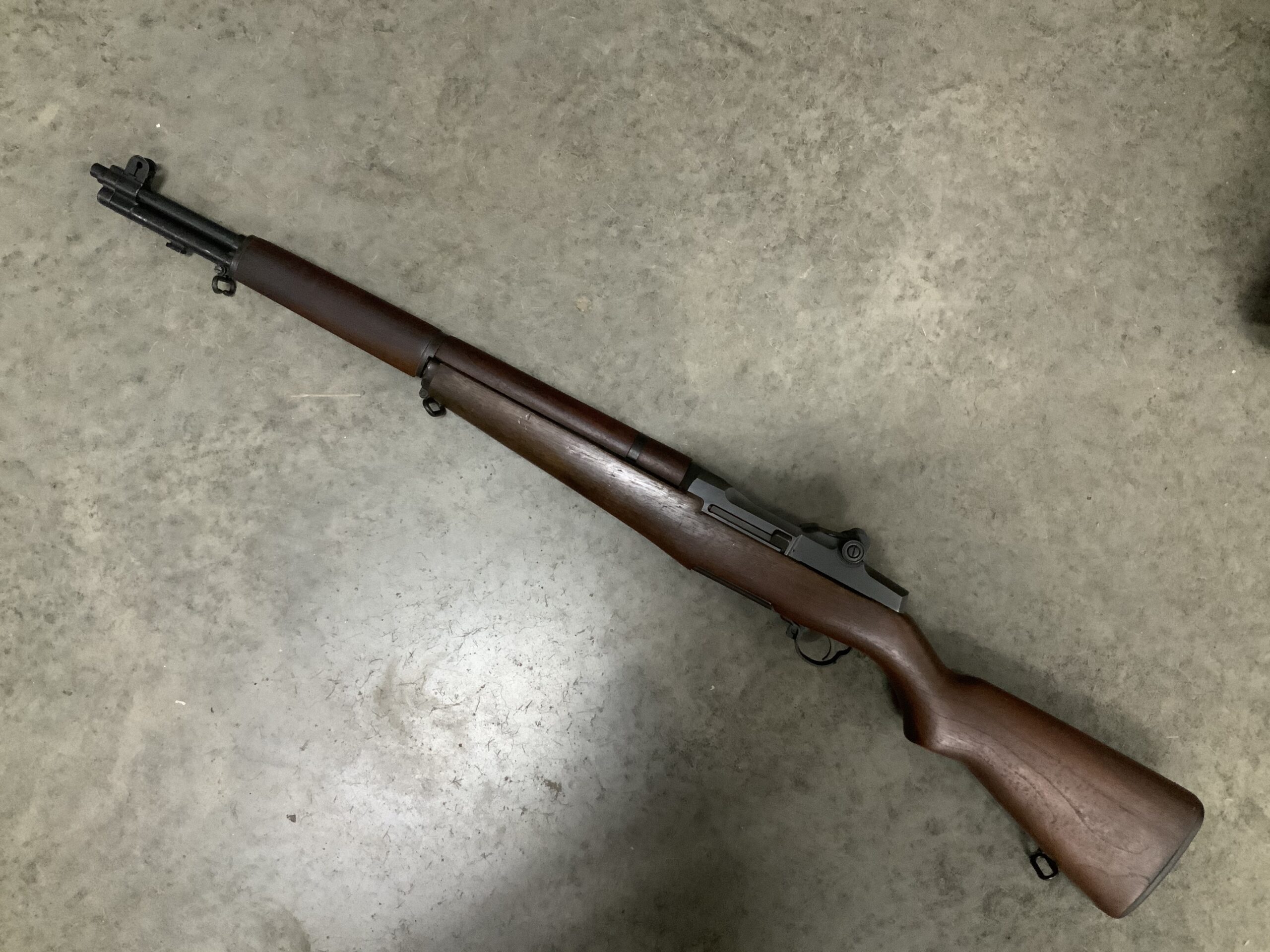 Serial Number: 7006917, 30-06, 24in barrel with excellent bore. The rifle retains about 99% original gray parkerized finish with light wear on contact points and high edges, and a few scattered light handling marks. The walnut stock is in very good plus condition with a 1/2″ square chip at the toe, a light abrasion on the left side of the stock by the receiver, and a few light handling marks. The glass-bedded stock is unmarked and the hand guard appears to be of a different piece of walnut. The receiver markings remain crisp and the barrel is unmarked. The parts of the rifle are of mixed origin, with the trigger housing and bolt marked “-8-SA” and “-12SA” respectively, an H&R manufactured M14 hammer, an operating rod and gas cylinder lock manufactured by Beretta, and a “NM” marked front sight which has red lacquer applied. Unfortunately, the “NM” marked rear sight aperture is broken but replacement rear sight apertures are commonly available. Altogether a nice newer production M1 rifle that with a little work will be fun at the range.