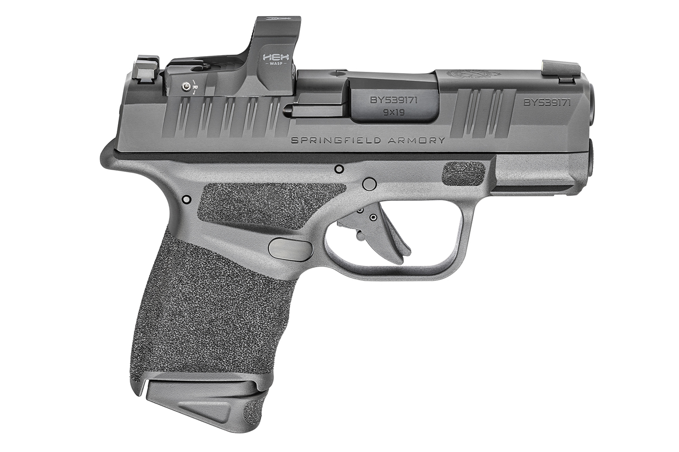 The springfield hellcat micro-compact 9mm pistol with hex wasp red dot is built around a 3-inch barrel and a slim, textured grip frame that holds 11+1 rounds flush or 13+1 with the included extended magazine. The HEX WASP red dot is factory-mounted and co-witnesses with the low-profile Tritium front and Tactical Rack rear sights, giving you immediate sight alignment whether you use the dot or the irons. This is not a slide-milled adapter plate setup; the optic is direct-mounted for a lower bore axis and zero retention issues. At just over 18 ounces unloaded, it carries like a subcompact but shoots with the controllability of a larger frame.