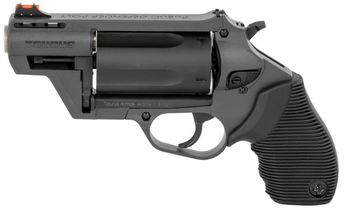 The Judge Public Defender by Taurus delivers the same devastating power as the Judge in a scaled-down size that’s easy to carry. The Public Defender features a reduced profile hammer, an extended ejector rod, a ribber grip, the Taurus Security System, a transfer bar, and a red fiber optic fixed front sight.