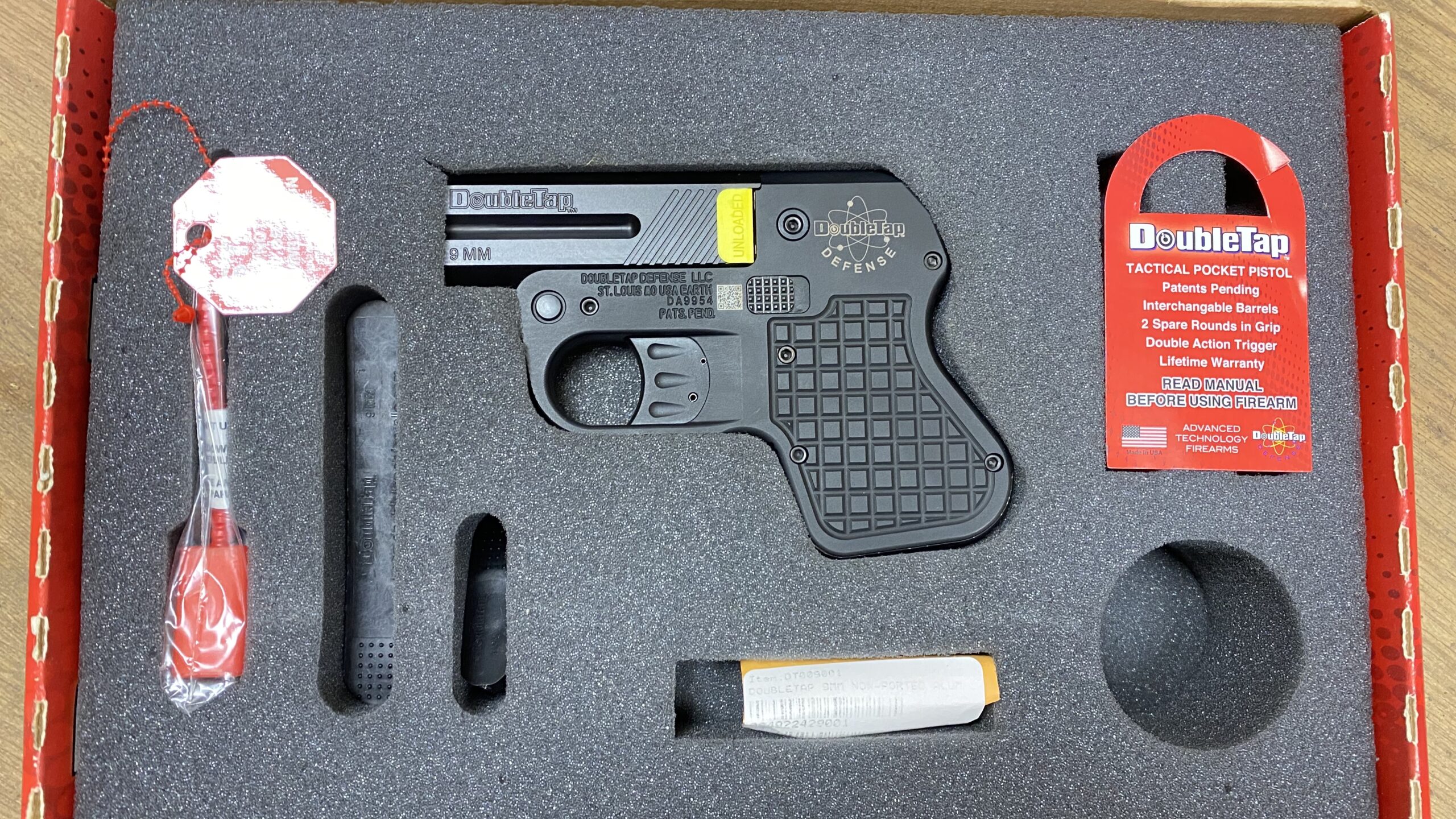 Used and in excellent condition. Looks lightly used. Ships in original box. Pop top design with two non-ported barrels. Spare round holder in grip.
