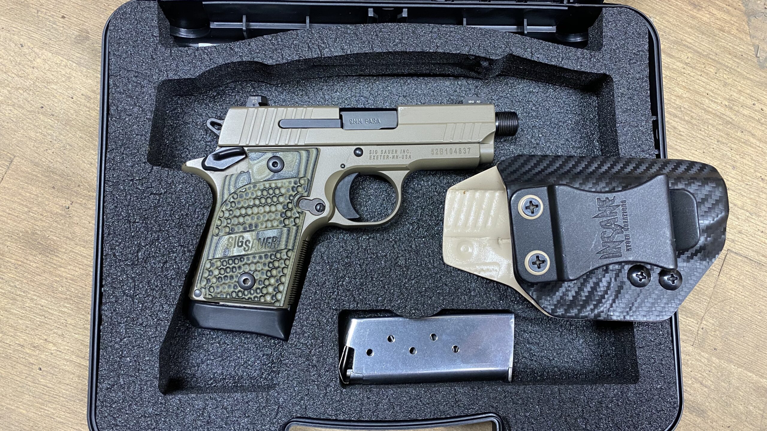 Used in great condition. Holster wear present. Ships with two magazines. One 7 round, and one 6 round. Includes Black Kydex holster. Thread protector is missing. Tritium night sights. Ambi safety.